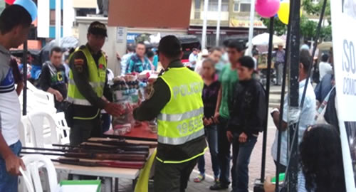 La actividad desarrollada en el parque principal de la localidad, se realizó como un mecanismo de prevención, así mismo sirvió como punto de sensibilización a la comunidad para que participe del plan desarme.En la actividad fueron entregados de manera voluntaria varios elementos bélicos, 40 armas blancas y 6 armas de fuego, entre ellas 4 escopetas, un revolver y un arma de fuego artesanal, a cambio la comunidad recibió mercados.Cabe destacar que los habitantes de Belén de Umbría acogieron la estrategia y comprometidos, continuarán participando de los programas liderados por la Policía.