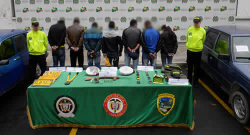 Actividades de Policía Judicial en coordinación con la Fiscalía General de la Nación, permitieron desarticular la banda delincuencial denominada "Los muleros", conformada por siete personas dentro de ellas una mujer, inmovilizar dos vehículos e incautar dos armas de fuego, dos inhibidores de señal, prendas de uso privativo de las Fuerzas Militares y Policía Nacional, incluido un brazalete de Tránsito y Transporte, herramientas y demás elementos que utilizaban para cometer hurtos a vehículos y mercancías sobre la red vial del departamento de Cundinamarca y la ciudad de Bogotá, especialmente en corredores aledaños a la ciudad Capital, donde implementaban falsos puestos de control, haciéndose pasar por fuerza pública.La desarticulación de esta organización delincuencial se dio gracias a la denuncia de los afectados y a labores de investigación efectuadas hace aproximadamente un año. Luego que la Dirección de Tránsito y Transporte de la Policía Nacional hiciera sus indagaciones y analizara detalladamente las evidencias, en coordinación con la Fiscalía General de la Nación, se procedió a realizar las diligencias de allanamiento en la ciudad de Bogotá y el municipio de Soacha, sitios en los que se dio captura a estos ciudadanos.Según investigaciones, los integrantes de esta red delincuencial al parecer habían efectuado robos avaluados aproximadamente por 7 mil millones de pesos, y no solo hurtaban tracto-camiones de parqueaderos sino que también solían hacer seguimientos en vehículos pequeños sobre la vía o haciendo estacionarias para informar a otro grupo que se encontraba más adelante y sería el encargado de simular puestos de control para interceptar los automotores.Durante lo corrido de 2015 la Dirección de Tránsito y Transporte de la Policía en coordinación con la Fiscalía General de la Nación, ha desarticulado 13 bandas delincuenciales dedicadas al hurto de mercancía y vehículos en la modalidad de piratería terrestre.