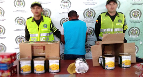 Teniendo en cuenta la consolidación de la estrategia institucional para la seguridad ciudadana, una vez más el cuadrante Vial N°2 de la Policía de Tránsito y Transporte de la Metropolitana de Pereira, mediante el desarrollo de planes de registro a vehículos y personas, capturó a un hombre de 54 años de edad, momentos en que viajaba como pasajero en un bus de servicio público.Al revisar a los ocupantes y maletas de mencionado vehículo se halló al interior del equipaje al de la persona en mención, encontrando en su interior dos cajas de cartón, estas a su vez con seis tarros de alimento; de acuerdo a lo informado el contenido correspondió a 18 bloques envueltos en cinta color gris los cuales se determinó correspondían a 7 mil gramos de clorhidrato de cocaína.El caso fue puesto en conocimiento de la autoridad competente.