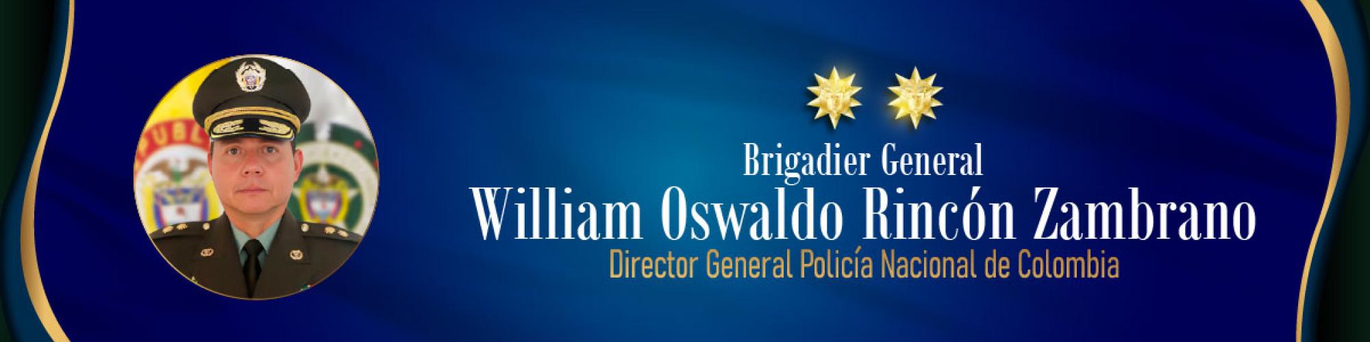 El señor brigadier general William Oswaldo Rincón Zambrano, nació en Bogotá D.C. en el año de 1969. Con más de treinta y tres años de servicio en la Policía Nacional de Colombia, se ha destacado por su liderazgo ético, compromiso con la transparencia institucional e incansable labor en favor de la juventud y la construcción de paz.