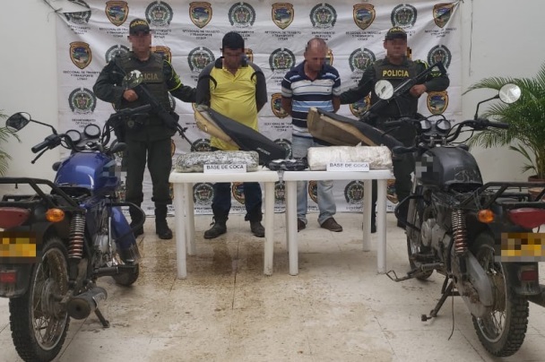En desarrollo del plan choque, ‘El que la hace la paga’, la Policía Nacional a través de integrantes de la Seccional de transito y trasnporte ubicados al sur del Deparamento de Cesar; lograron en las ultimas horas las capturas de dos hombres mediante planes de registro y control en la via que de Ocaña ( Norte de Santander) conduce a Aguachica, los cuales transportaban en dos motocicletas doce kilogramos de cocaina camufladas y distribuidas en las mismas con el fin de evadir a las autoridades.