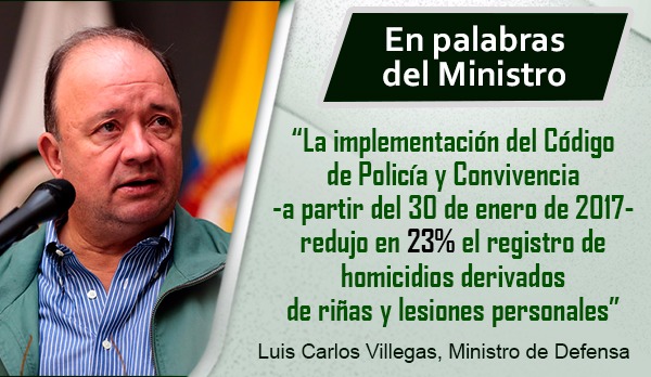 La implementación del Código Nacional de Policía y Convivencia a partir del 30 de enero de 2017, logró la reducción de un 23% en el registro de homicidios derivados de riñas y lesiones personales generadas por consumo de alcohol y drogas, intolerancia, peleas entre vecinos, entre otras. Así lo reveló este jueves el ministro de Defensa, Luis Carlos Villegas, durante un Puesto de Mando Unificado (PMU) en el que participaron los comandantes regionales de la Policía Nacional.