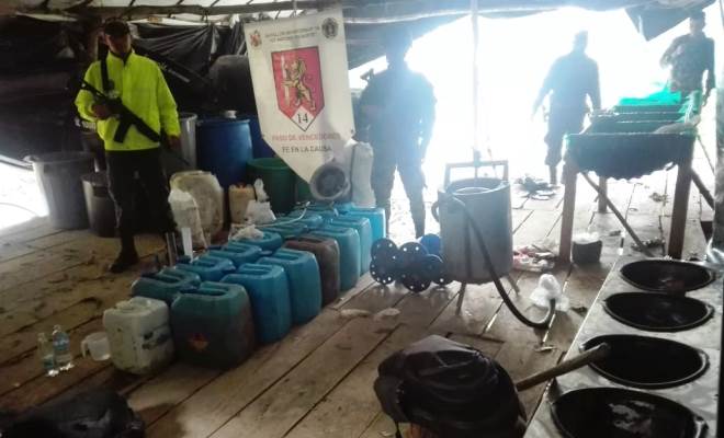 Es así como en las últimas horas, integrantes del Ejército y la Policía llegan a un punto de la vereda, donde fue destruido un laboratorio para el procesamiento de clorhidrato de cocaína, en donde fueron incautados 338 gramos de coca, igualmente se destruyeron insumos líquidos y sólidos, relacionados así: dos construcciones artesanales en madera y plásticos, tres hornos microondas, cinco mesas de madera, una prensa hidráulica, 1000 unidades de papel filtro, dos cuartos de secado, un extractor de aire, dos probetas de 500, dos vasos dosificadores uno de 600 ml y otro de 400 ml, un gusano acerado de 6 huecos, un escurridero de madera y malla plástica de 5 cavidades, una pipeta de calentamiento de agua, un destilador en material de acero, 20 kilos de soda cáustica, 1334 gramos de carbón activado, 12 canecas de acetona de 5 galones cada una, total avaluó de elementos destruidos $52.900.000.