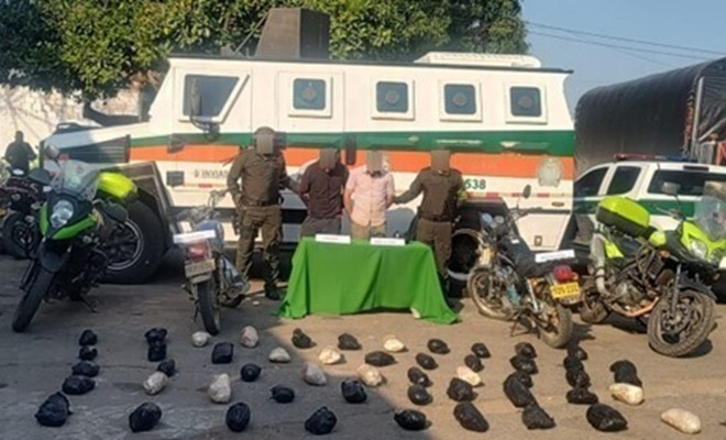 En labores propias del servicio de policía, personal adscrito a la seccional de tránsito, en vía La Mata – San Roque donde se encontraban realizando registro y control a vehículos, al momento de registrar una motocicleta de color negro, transportando en la parte trasera dos costales de papel encontrándoles en su interior 53 paquetes rectangulares envueltos en cintas negras y transparentes que al verificar se halla una sustancia rocosa con un peso aproximado de 72.000 gramos, que por su olor color y características se asemeja a las de base de coca.