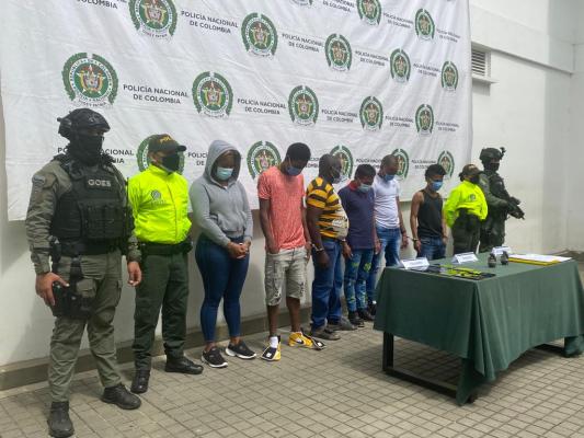 • 6 personas capturadas-policías custodiando-elementos incautados