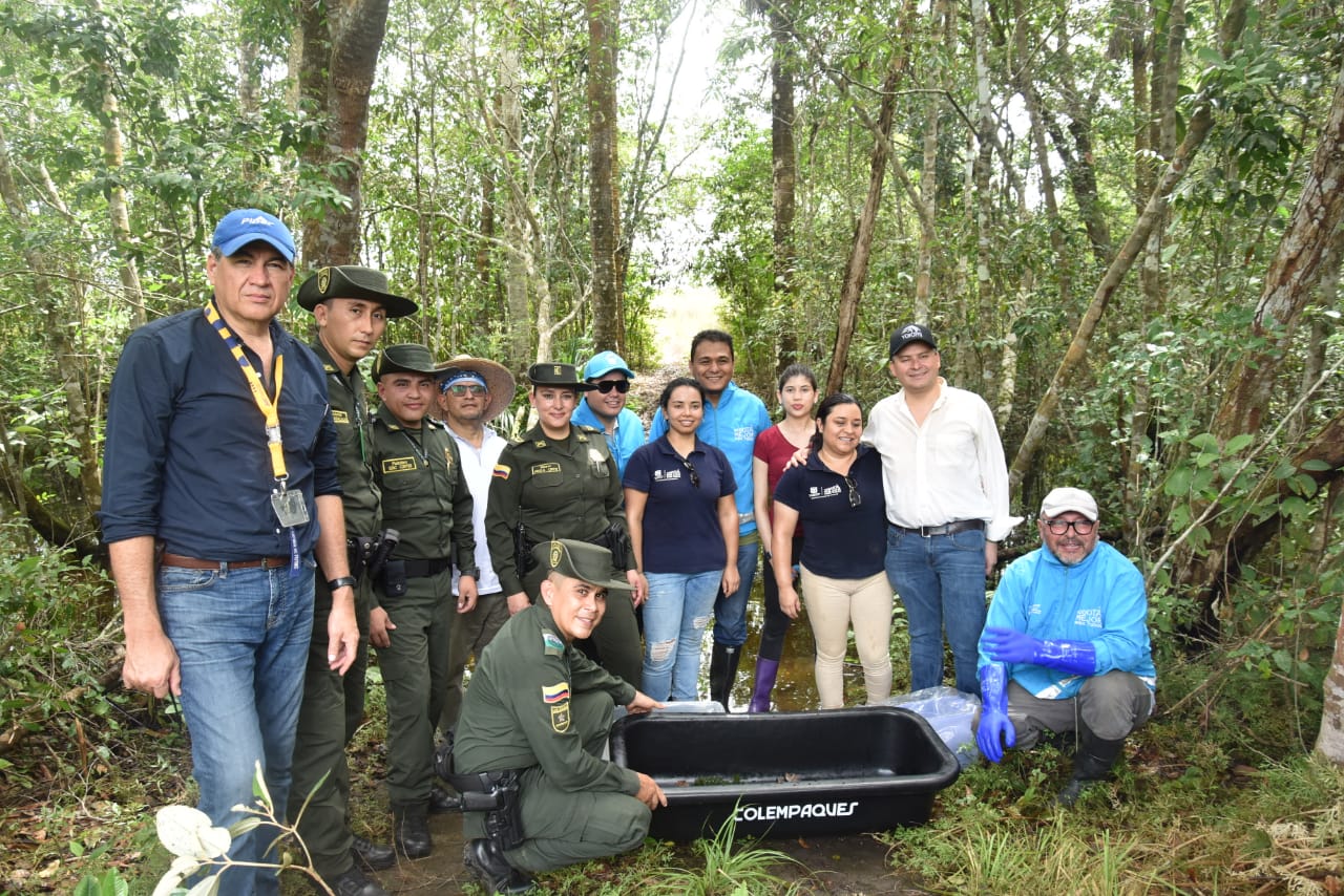 El pasado 16 de abril en el aeropuerto Internacional El Dorado de la capital colombiana, los uniformados de la Policía Ambiental y Ecológica, lograron incautar 1.359 tortugas, las cuales eran transportadas en cajas y bolsas plásticas por correo de carga en la ruta que conduce de Bogotá a Leticia, atentando contra su vida; estas especies una vez rescatadas fueron puestas a disposición del Centro de Recepción de Fauna Silvestres de la Secretaria Distrital de Ambiente y en custodia del Instituto de Protección y Bienestar Animal – IDPYBA para su total recuperación. En Puerto López y Puerto Gaitán, luego de varios meses de su proceso de rehabilitación, se logra liberar a 800 tortugas de especie matamata en la Reserva Privada Natural de la Sociedad Civil Yurumi y la Reserva Natural Maicina Macanal de los llanos orientales devolviéndolas a su hábitat natural en coordinación con CORMACARENA, coadyuvando al mejoramiento de las condiciones de salud, alimentación y reproducción en un ecosistema natural acorde a sus necesidades. Estas especies son de agua dulce y son apetecidas por el comercio internacional ilícito para ser comercializadas como “mascotas” exóticas, poniendo en riesgo su integridad. Las 500 especies de tortugas faltantes serán liberadas en los meses de julio y agosto en los departamentos de Bolívar y Atlántico, aportando de esta manera a la regulación del ambiente y recursos naturales.
