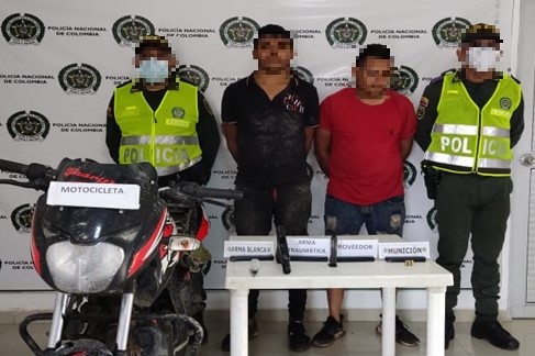 Los aprehendidos se le realiza un registro a persona encontrándole en su poder un arma corto punzante tipo cuchillo y un arma traumática en la pretina del pantalón del conductor de la moto, al momento de solicitarle antecedentes judiciales estos presentan anotaciones por el delito de porte ilegal de armas de fuego y hurto.