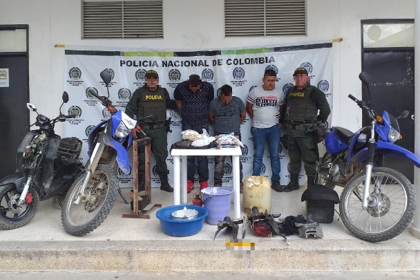 En este lugar se incautan 1.000 gramos de cocaína, 3.000 gramos de base de coca, avaluados 15 millones 700 mil pesos, tres galones de gasolina, un balde de color morado, una ponchera color azul, una olla de aluminio, dos motocicletas, un gato hidráulico, una gramera, una prensa metálica, dos moldes, una plantilla metálica, cuatro celulares.
