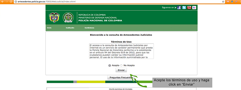 Al ingresar encuentra los términos de uso los cuales sugerimos revisarlos antes de ingresar, los acepta y envía el formulario.