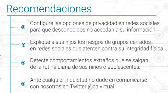 El compromiso es de todos mientras la Policía Nacional de Colombia trabaja de manera coordinada con homologas en todo el mundo y toma un papel importante en la investigación de estos casos en la red, es importante que padres y adultos controlen la cantidad de información que publican sus hijos en las redes sociales, nuevos seguidores y personas desconocidas que envían datos a sus hijos o familiares para ser contactados.