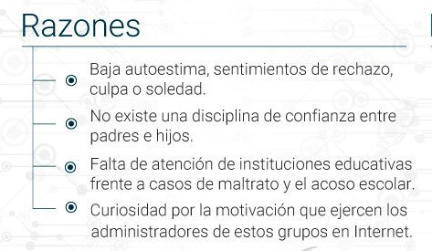 Un fenómeno en la red que tuvo origen en el continente europeo pero que progresivamente está tocando países del continente americano. La alerta comienza con  personas que sugieren unirse a grupo con el fin de realizar juegos o retos por determinado tiempo, lo cual mantiene la atención de los seguidores especialmente adolescentes entre 12 y 14 años sin despertar sospecha; sin embargo al avanzar las consecuencias pueden conllevar a la inducción al daño físico de los participantes y en el peor de los casos el suicidio.