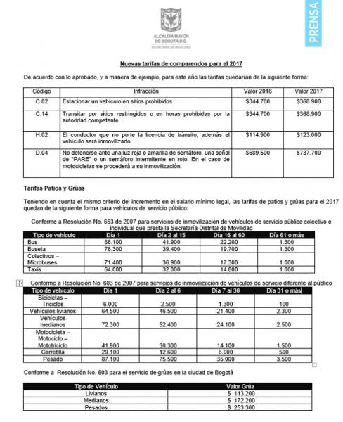 A través de comunicado de prensa, la Secretaría Distrital de Movilidad dio a conocer las tablas con el ajuste de valores en patios y grúas a partir del 1 de enero de 2017, vale la pena recordar que las tarifas de comparendos aplican para todo el territorio nacional y las de patios y grúas únicamente para el Distrito Capital.