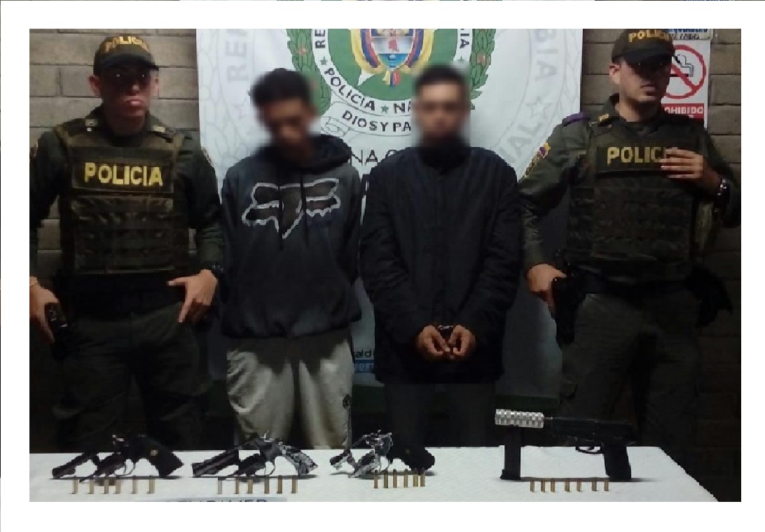 La Policía Nacional de Colombia, en desarrollo del Plan Choque “El que la hace la paga”, tercera fase “Construyendo seguridad”, en las labores de patrullaje y control logramos sorprender en la comuna 16 Belén de Medellín, a dos hombres que tenían en su poder cuatro armas de fuego ilegales, con munición y hasta un supresor de sonido.