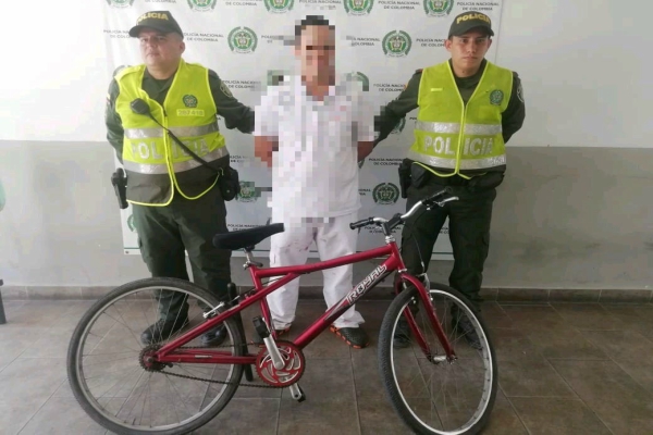 Se logra la captura en flagrancia de un sujeto de 28 años de edad, a quien se le hallo en su poder una bicicleta tipo todo terreno, color vino tinto, avaluada en $200.000, la cual figura como hurtada bajo denuncia instaurada en días pasado, siendo la victima un sujeto de 24 años de edad.