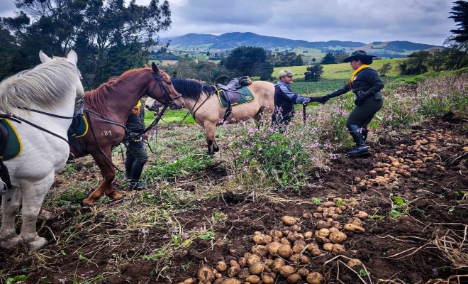 En los caminos tibios que cruzan el departamento de Bolívar, cuando el sol apenas empieza a pintar de oro las hojas de plátano, se escucha el repique suave de los cascos sobre la tierra húmeda. Es el sonido inconfundible de los Carabineros de la Policía Nacional de Colombia, que avanzan entre veredas y potreros como quien visita a la familia.
