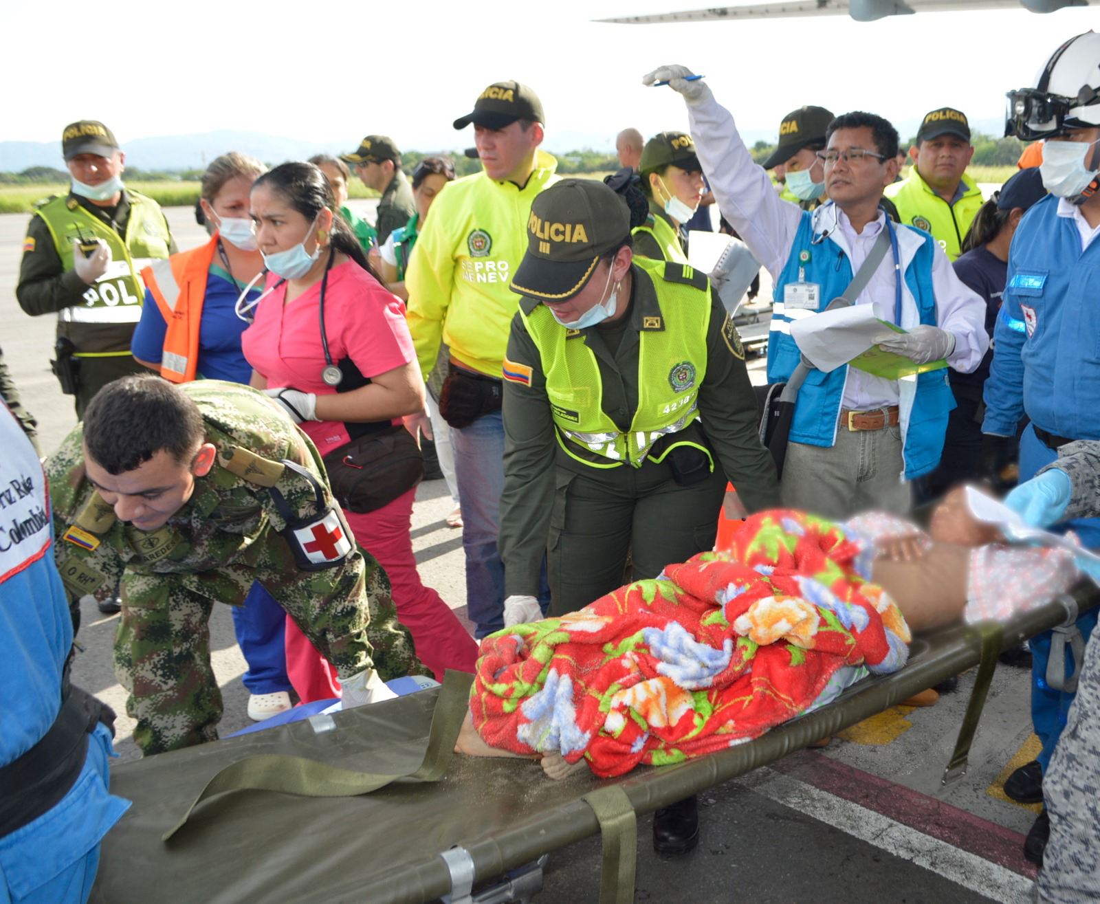Durante la tarde de ayer y aún continúan nuestros uniformados adscritos a la Policía Metropolitana de Neiva de la Policía Nacional y de apoyo Ponalsar, participando en la operación humanitaria de traslado desde la plataforma del Aeropuerto Benito Salas de Neiva hasta los diferentes Centros de Salud de la capital opita.